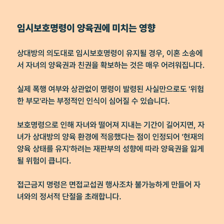 상대방의 의도대로 임시보호명령이 유지될 경우, 이혼 소송에서 자녀의 양육권과 친권을 확보하는 것은 매우 어려워집니다. 재판부는 자녀의 복리를 최우선으로 고려하며, 폭력적인 성향이 의심되는 부모에게 양육권을 맡기지 않기 때문입니다.