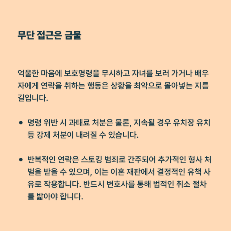 억울한 마음에 보호명령을 무시하고 자녀를 보러 가거나 배우자에게 연락을 취하는 행동은 상황을 최악으로 몰아넣는 지름길입니다.