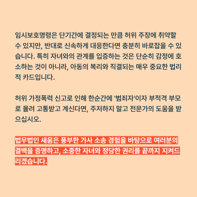 임시보호명령은 단기간에 결정되는 만큼 허위 주장에 취약할 수 있지만, 반대로 신속하게 대응한다면 충분히 바로잡을 수 있습니다. 특히 자녀와의 관계를 입증하는 것은 단순히 감정에 호소하는 것이 아니라, 아동의 복리와 직결되는 매우 중요한 법리적 카드입니다.