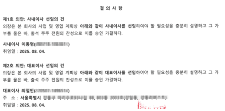 등기맨과 최앤리가 실제로 작성한 의사록 일부를 예시로 보여드리겠습니다.