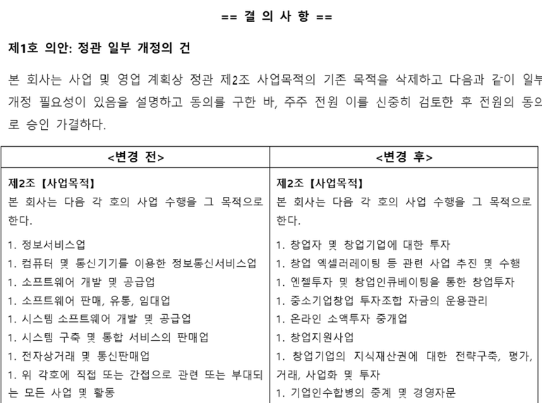 사업목적 변경은 정기주주총회에서 자주 다뤄지는 대표적인 결의사항입니다. 사업목적은 법인등기부와 정관에 모두 반영되므로, 통상 정관 일부 개정의 건으로 결의합니다.
