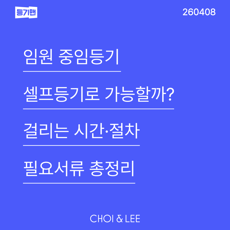 통상적으로 등기 완료까지 며칠이 걸릴까요? 중임등기는 딱 잘라 며칠이라고 말하기 어렵습니다. 법적으로는 변경원인(결의) 후 2주 안에 신청해야 하고, 실제 체감 시간은 서류를 얼마나 정확히 준비했는지에 따라 갈립니다. 한 번에 정리되면 접수 자체는 빠를 수 있지만, 결의기관 판단이나 첨부서류가 어긋나면 그때부터 시간이 오래걸립니다. 이후에 등기소에서 보정이 나오면다면 일정에 큰 차질이 발생할 수 있습니다.