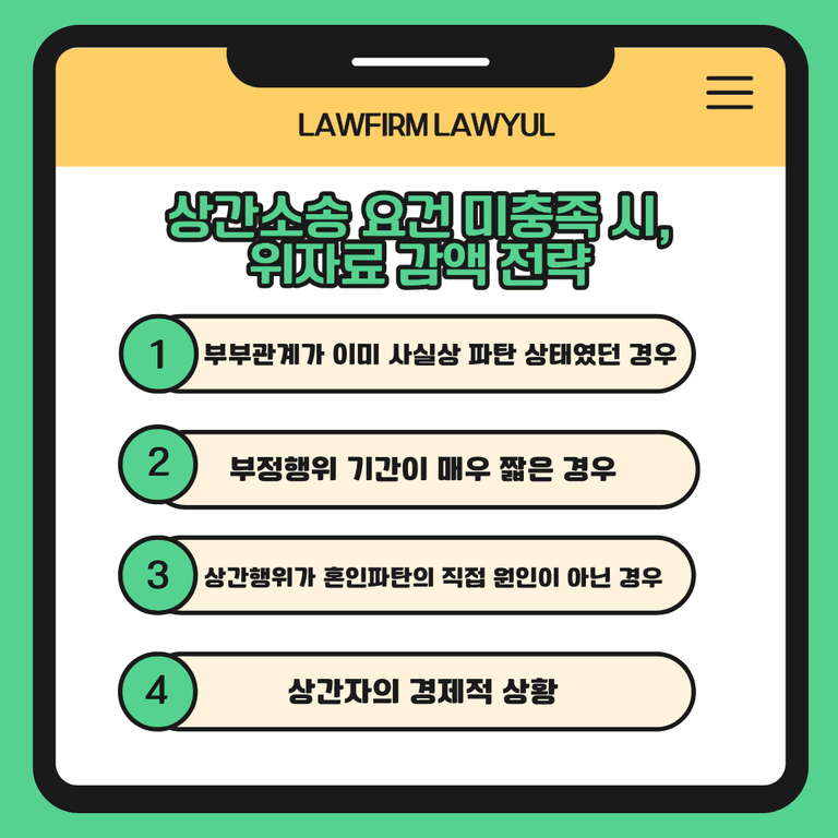 3. 🔸 상간소송 요건 미충족 시, 위자료 감액 전략 (기각이 어려운 경우)