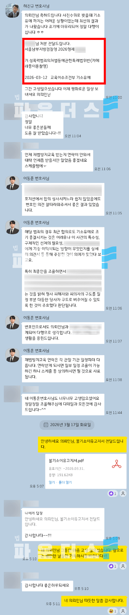 ④ 변호인의견서 제출 의뢰인이 범행을 인정하고 깊이 반성하고 있는 점, 합의가 원만히 이루어진 점, 촬영물의 외부 유포 가능성 및 2차 피해 위험이 없는 점 등을 종합적으로 정리한 변호인의견서를 작성하여 최대한의 선처를 요청하였습니다.