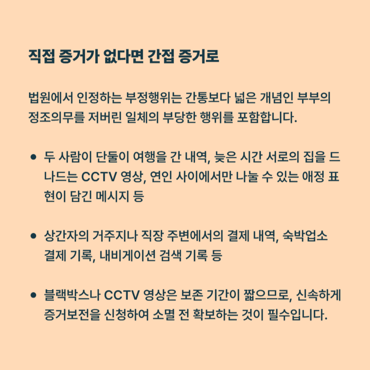 정황 증거 수집: 두 사람이 단둘이 여행을 간 내역, 늦은 시간 서로의 집을 드나드는 CCTV 영상, 연인 사이에서만 나눌 수 있는 애정 표현이 담긴 메시지 등을 확보해야 합니다.