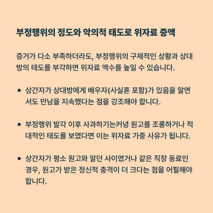증거가 다소 부족하더라도, 부정행위의 구체적인 상황과 발각 이후 상대방의 태도를 부각하면 위자료 액수를 높일 수 있습니다.