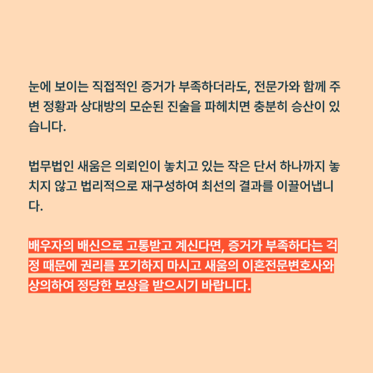 법무법인 새움은 의뢰인이 놓치고 있는 작은 단서 하나까지 놓치지 않고 법리적으로 재구성하여 최선의 결과를 이끌어냅니다. 배우자의 배신으로 고통받고 계신다면, 증거가 부족하다는 걱정 때문에 권리를 포기하지 마시고 새움의 이혼전문변호사와 상의하여 정당한 보상을 받으시기 바랍니다.