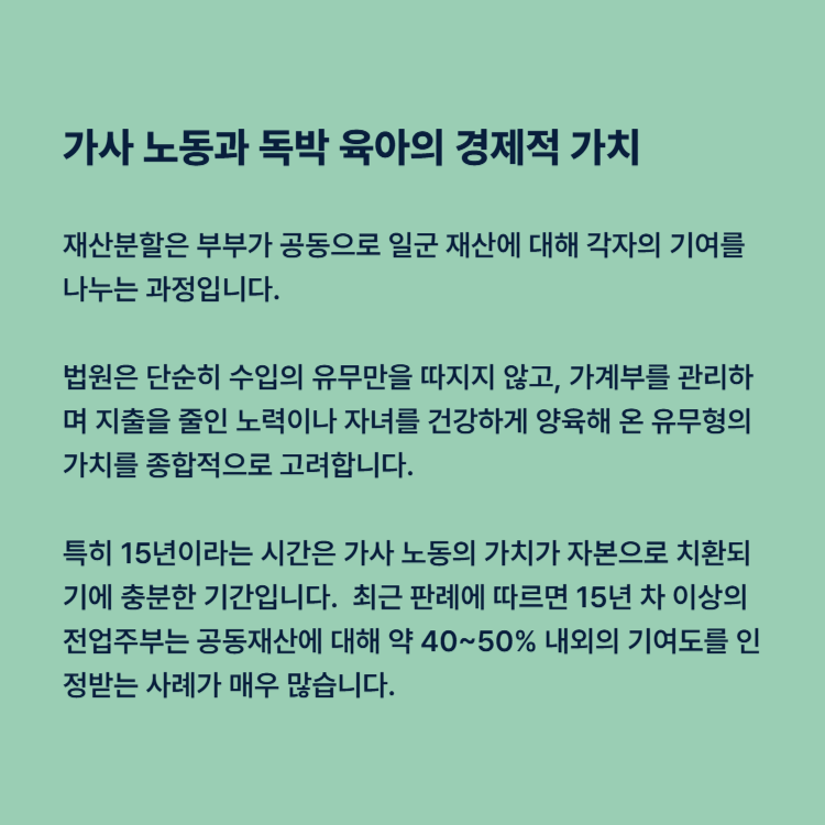 하지만 실무적으로 가사 노동과 육아는 엄연히 경제적 가치가 있는 노동으로 평가받으며, 혼인 기간이 길수록 그 기여는 두텁게 인정됩니다. 특히 15년 이상 가정을 지키며 시부모 병간호까지 도맡은 경우라면 재산 형성 및 유지에 대한 기여도가 어떻게 산정되는지 상세히 설명해 드리겠습니다.