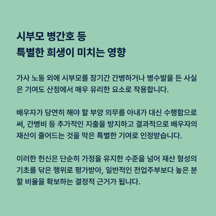 일반적인 가사 노동 외에 시부모를 장기간 간병하거나 병수발을 든 사실은 기여도 산정에서 매우 유리한 요소로 작용합니다. 이는 배우자가 당연히 해야 할 부양 의무를 아내가 대신 수행함으로써, 간병비 등 추가적인 지출을 방지하고 결과적으로 배우자의 재산이 줄어드는 것을 막은 특별한 기여로 인정받기 때문입니다.