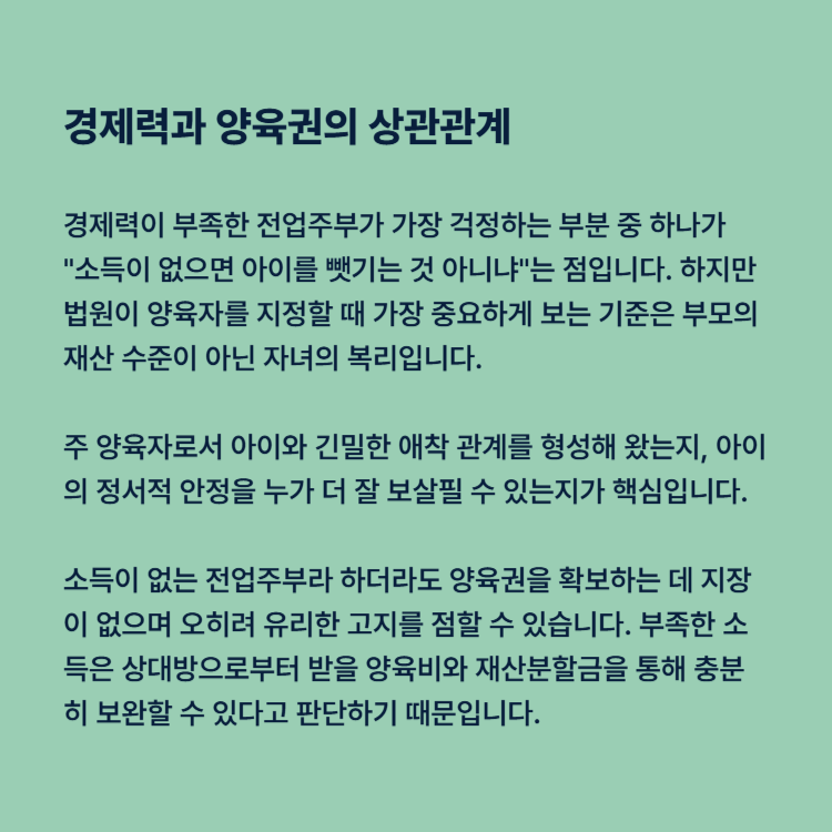 경제력이 부족한 전업주부가 가장 걱정하는 부분 중 하나가 "소득이 없으면 아이를 뺏기는 것 아니냐"는 점입니다. 하지만 법원이 양육자를 지정할 때 가장 중요하게 보는 기준은 부모의 재산 수준이 아닌 자녀의 복리입니다.