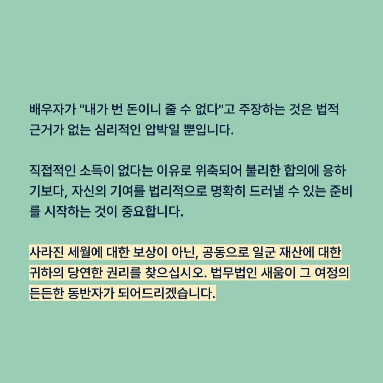 직접적인 소득이 없다는 이유로 위축되어 불리한 합의에 응하기보다, 자신의 기여를 법리적으로 명확히 드러낼 수 있는 준비를 시작하는 것이 중요합니다. 사라진 세월에 대한 보상이 아닌, 공동으로 일군 재산에 대한 귀하의 당연한 권리를 찾으십시오. 법무법인 새움이 그 여정의 든든한 동반자가 되어드리겠습니다.