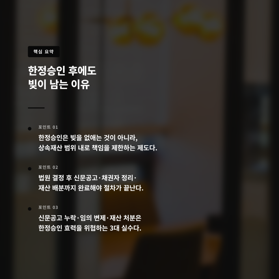 법원에서 한정승인 결정이 나면 많은 분들이“이제 끝났다”고 생각하시지만 실무에서는 그 다음 단계가 더 중요합니다.