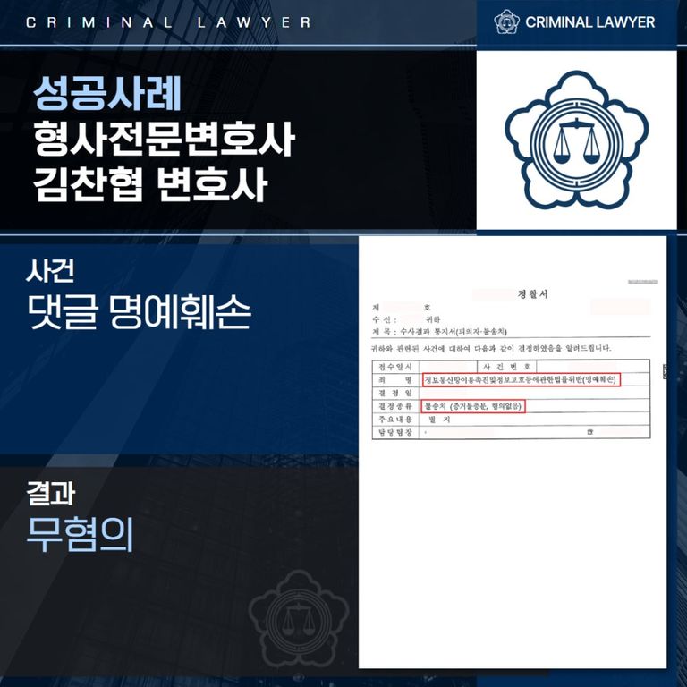 댓글 명예훼손 → 결과 : ‘무혐의’ 처분으로 종결