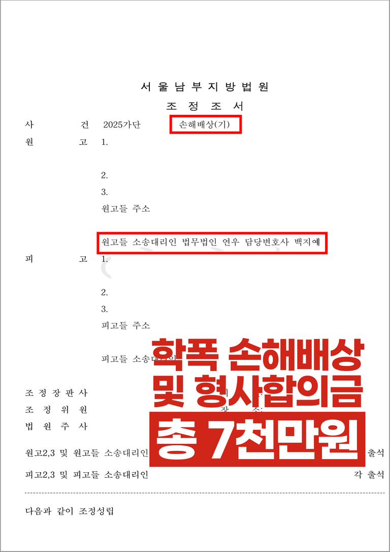 이후 의뢰인 측은 학교폭력으로 인해 발생한 신체적·정신적 피해에 대해 법적 대응을 진행하였고, 민사절차와 형사절차가 각각 이어지게 되었습니다.