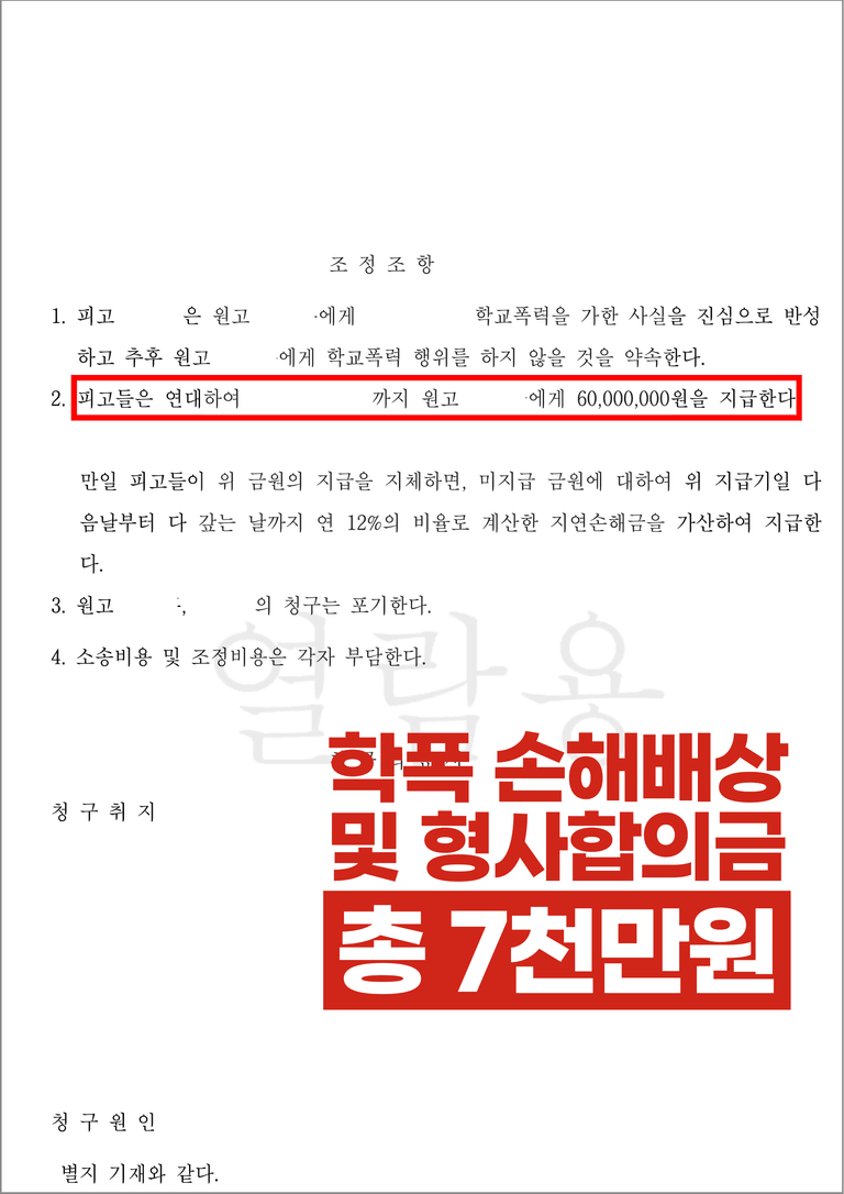 학교폭력 손해배상 6천만원 및 형사 합의금 1천만원 사례
