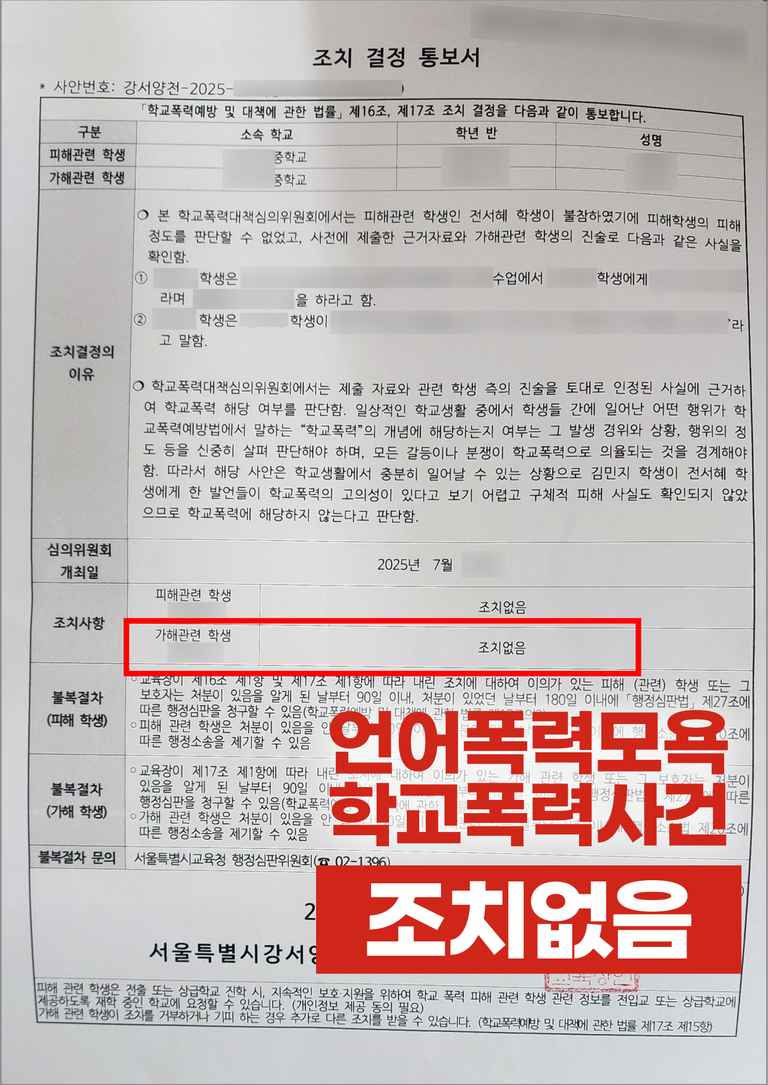 언어폭력 및 모욕 학교폭력 사건 조치없음 결정 사례