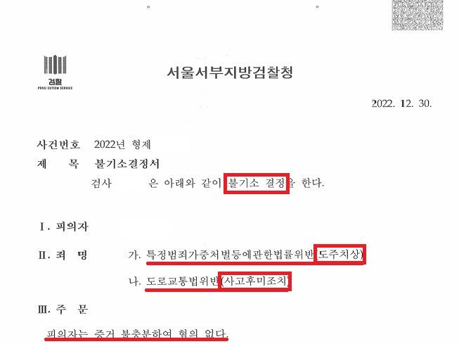 위와 같은 필자의 조력으로 담당 검사는 "의뢰인이 사고가 발생하였다는 사실을 알고 도주한다는 범의가 있었다고 인정하기 부족하다"라며 도주치상 및 사고 후 미조치 혐의에 대해 불기소 결정을 하였다.