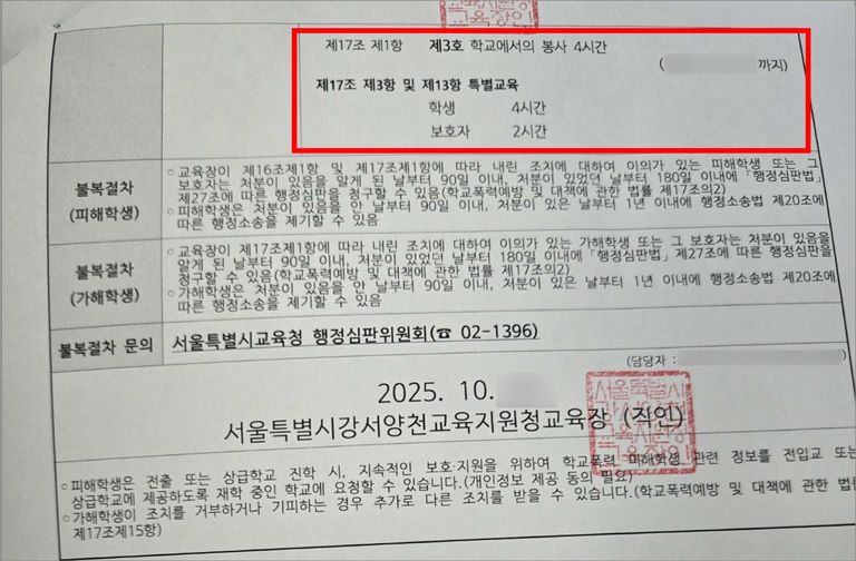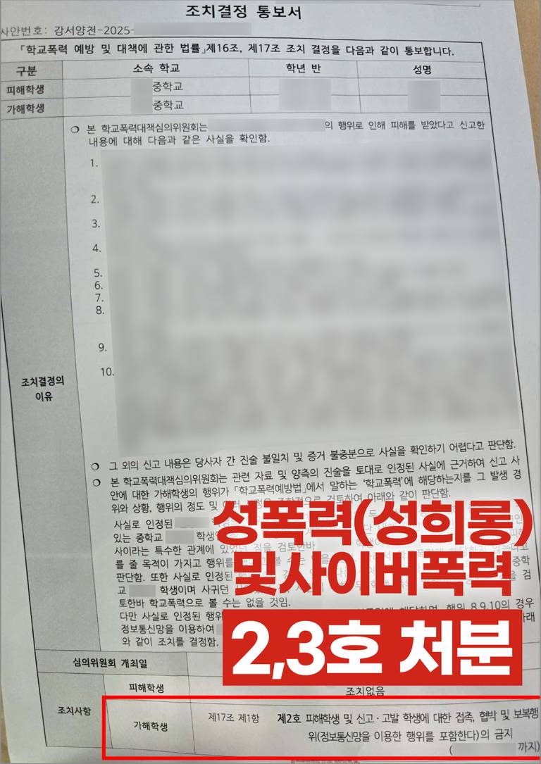 👉 인정된 행위에 대해서는 2호(접촉·협박·보복행위 금지)와 3호(학교에서의 봉사 4시간)의 경미한 처분이 내려졌습니다.