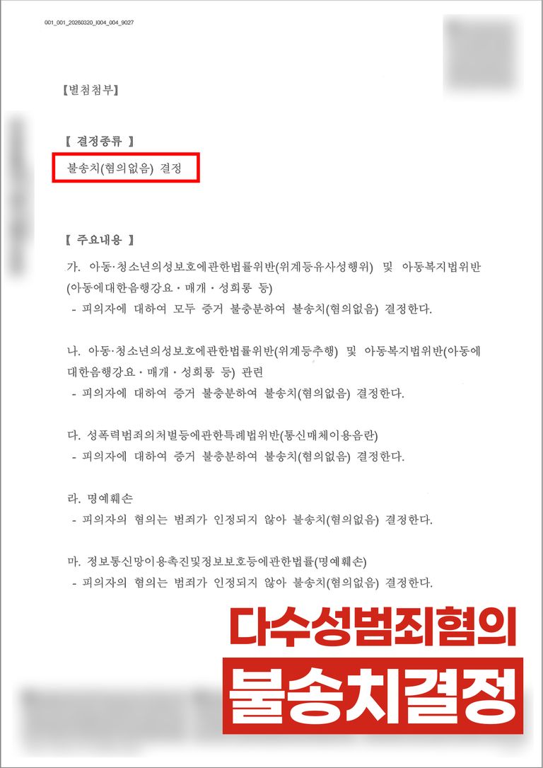 👉 형사 고소 사건에서는 모든 혐의에 대해 불송치(혐의없음) 결정이 내려졌습니다.
