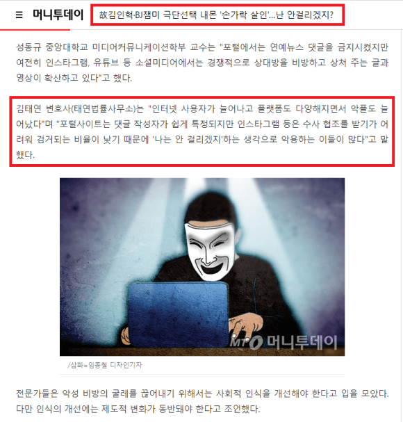 [출처: 머니투데이, 김태연 대표변호사님 악플고소 관련 언론보도]