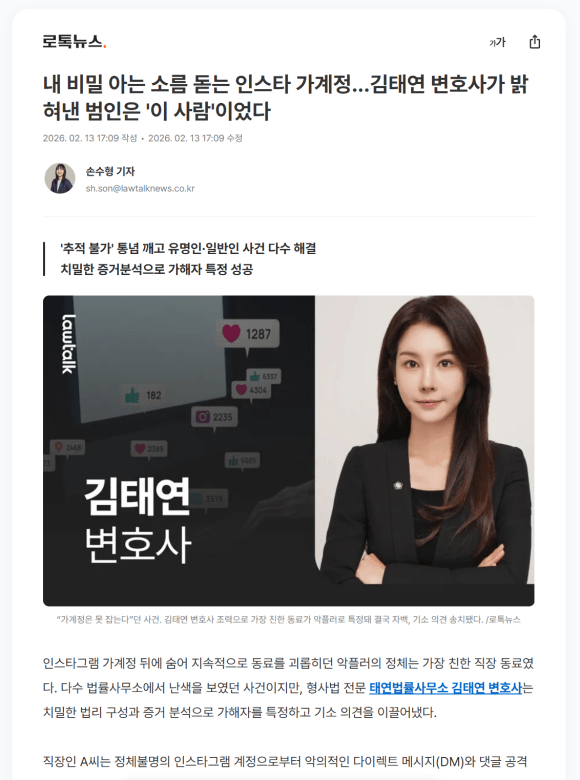 해당 뉴스 사례 속 실제 피해자 중 한 분이 바로 저희 태연법률사무소의 의뢰인이었다는 점입니다. 모두가 "가계정은 찾기 힘들다", "경찰에서 안 된다고 한다"라며 고개를 저을 때, 태연법률사무소는 포기하지 않았습니다. 김태연 대표변호사님만의 집요한 추적 노하우와 치밀한 법리 구성을 통해, 결국 가해자를 특정하는 데 성공했습니다. 이것이 바로 '결과로 증명하는 전문성'의 차이입니다.