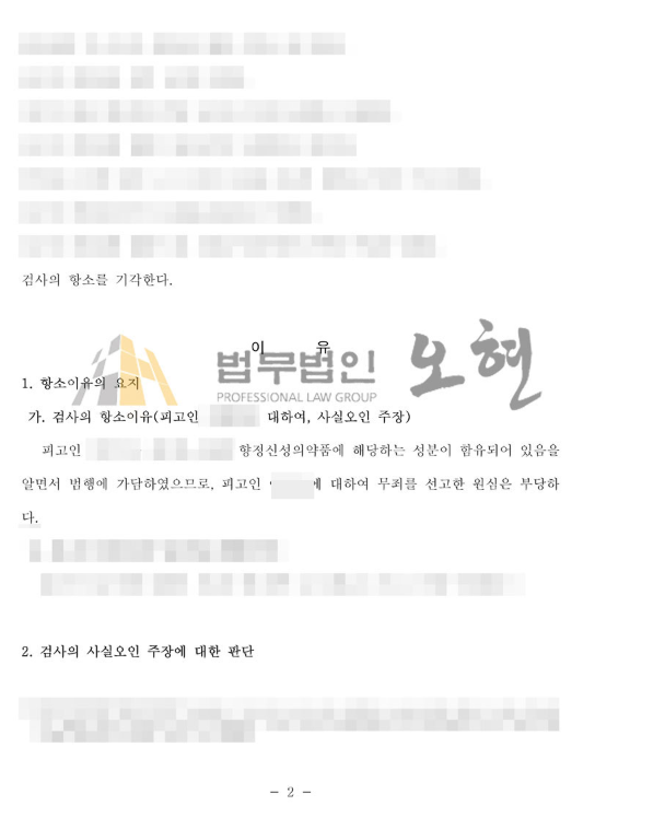 본 사건의 의뢰인 A씨는 해외에서 마약류가 함유된 다이어트 약을 수입하여, 국내에서 판매하는 등 마약류관리법 위반 혐의를 받게 되었습니다. 그러나 의뢰인 A씨는 이를 마약류로 인지하지 못하고 판매한 것이었습니다. 이에 따라 본 변호인은 1심 재판에서 A씨 마약류 거래에 있어서 마약류에 대한 인식이 존재하지 않았으며, 가담범위 역시 크지 않다는 취지로 범행을 부인하였으며 그 주장이 받아들여져 무죄를 선고받아 억울한 혐의를 벗게 되었습니다.