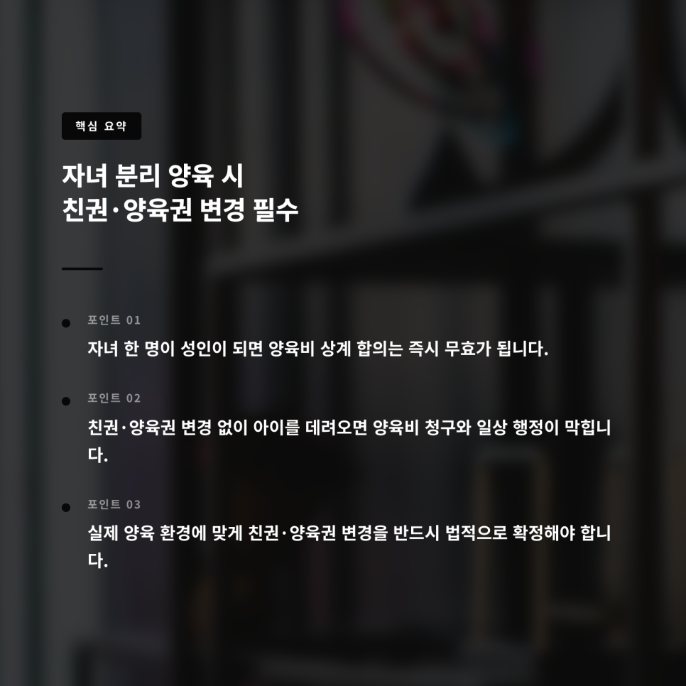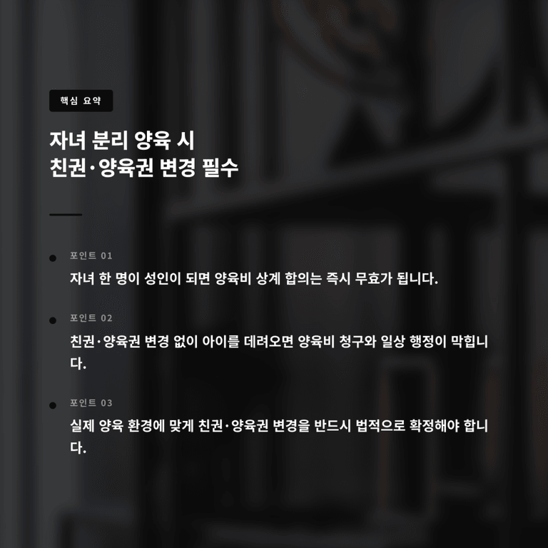 오늘은 이혼 후 자녀를 각자 키우는 경우 친권 양육권 변경을 하지 않았을 때 생기는 문제와 실제로 가장 많이 발생하는 리스크를 중심으로 정리해보겠습니다.