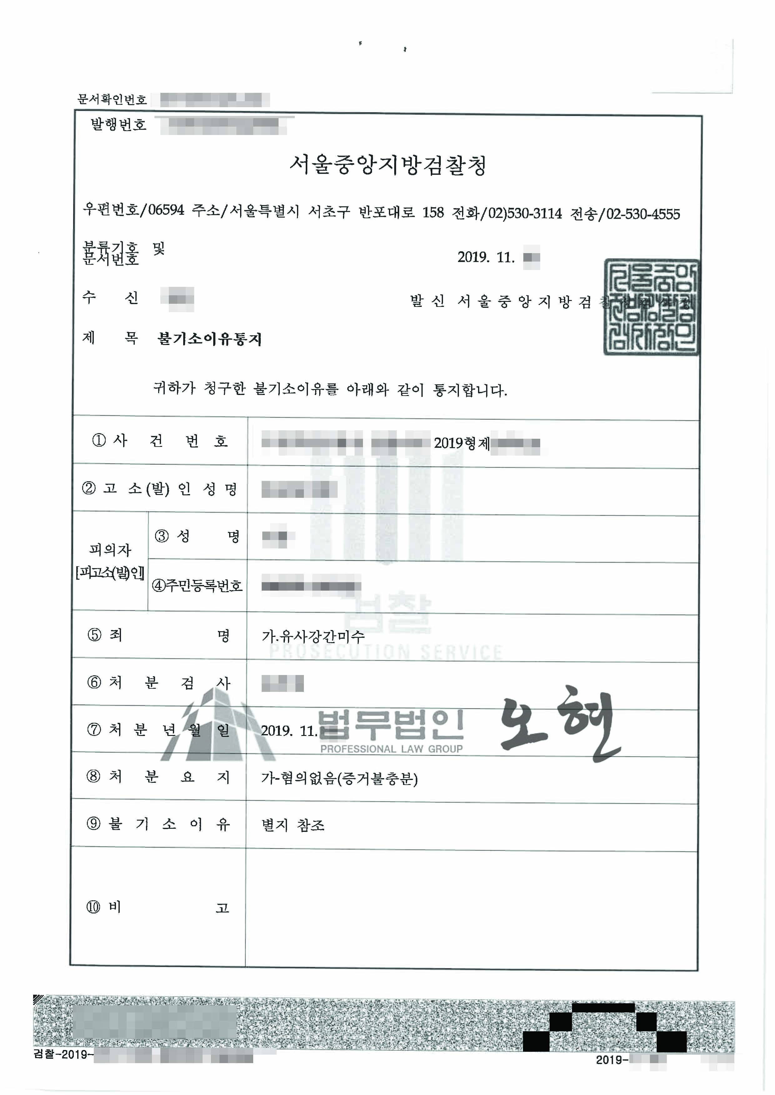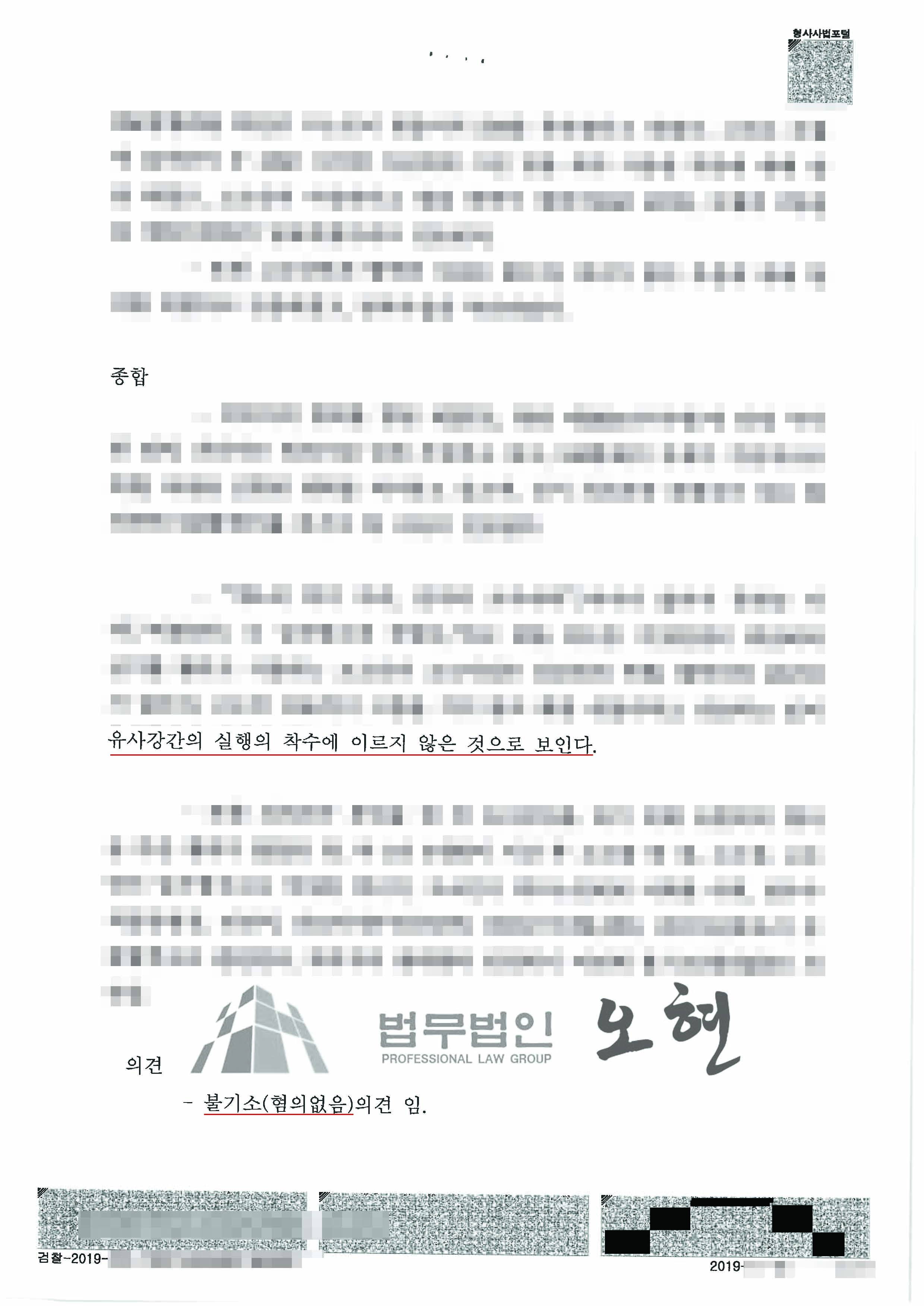 변호인의견서를 검토한 담당검사는 "유사강간의 실행의 착수에 이르지 않은 것으로 보인다"며 혐의없음 처분을 하였습니다.