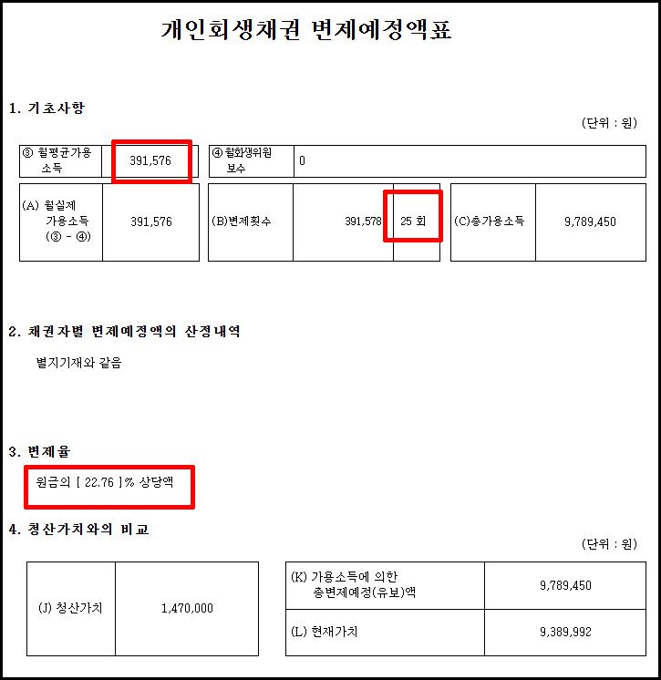 특히 일반적인 36개월이 아닌 25개월로 변제기간이 단축된 점, 그리고 월세 일부가 추가 생계비로 인정되어 변제금이 낮아진 점이 핵심이었습니다.