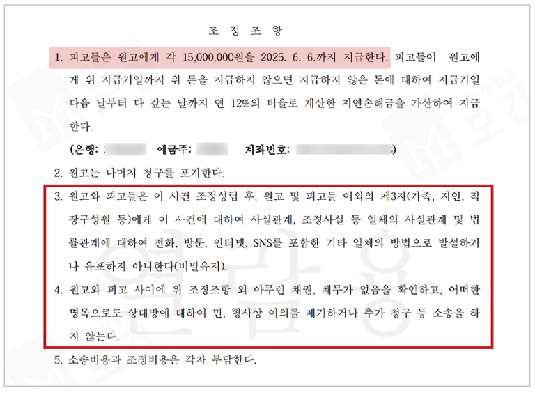 마지막으로 피고들이 원고에게 각 1,500만원 씩을 지급하되, 그 외에 서로에게 어떠한 채권채무가 없고, 어떠한 명목으로도 민·형사상 이의제기, 추가청구 등의 소송을 진행하지 않기로 하였습니다.
