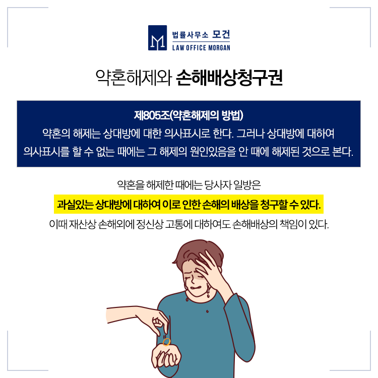 우리 민법에서는 약혼이 성립되었고, 한쪽의 과실로 약혼이 파기되었다면 그로인한 정신적인 고통에 대한 손해배상을 청구할 수 있도록 규정하고 있습니다.