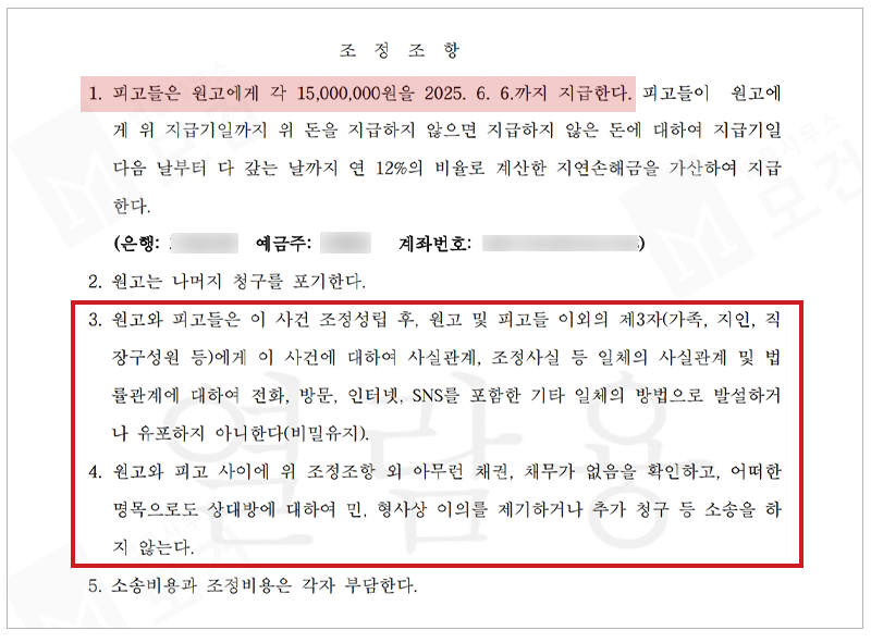 종로가사전문변호사는 이 파혼위자료 사안이 향후 원고나 제3자(가족, 지인 등)에 의해 유출될 시, 그로인한 피고들의 삶에 큰 악영향을 끼칠 위험을 고려해 조정조항에 '비밀유지' 조항을 포함시켰습니다.