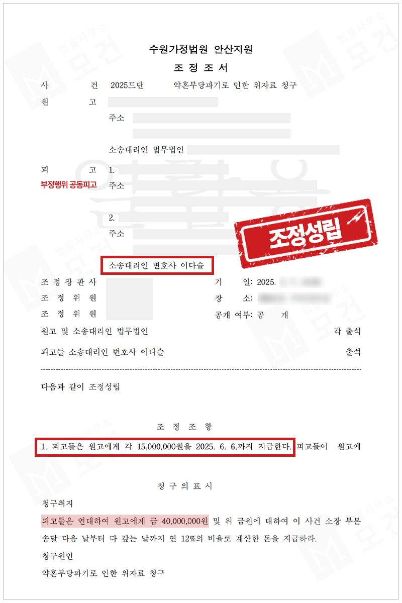 종로가사전문변호사는 의뢰인들과의 충분한 상담과 의사를 고려해, 피고들의 책임을 인정하되 빠르게 파혼위자료 청구소송을 종결하는 방향으로 조정을 진행하였습니다.