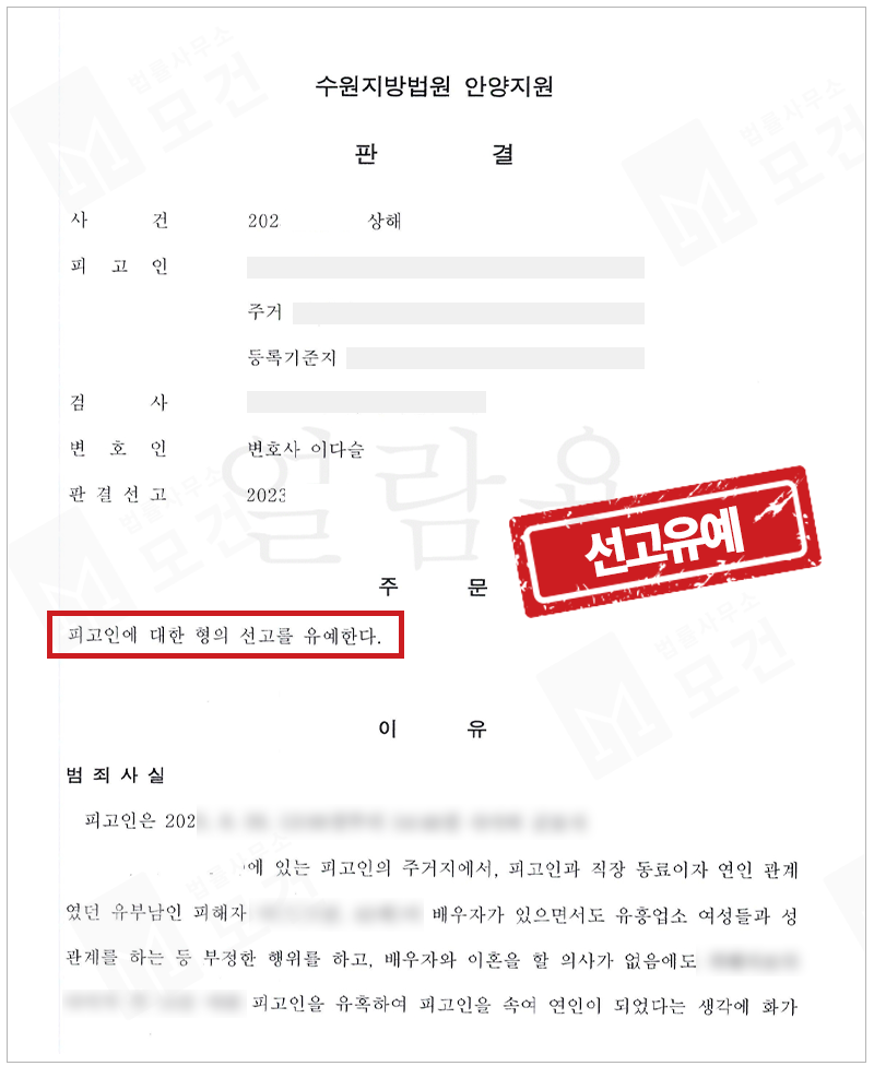 그결과 판사님께서 피고인의 여러 사정을 긍정적으로 참작해주셨고, 결국 <선고유예> 라는 좋은 결과를 받을 수 있었습니다.
