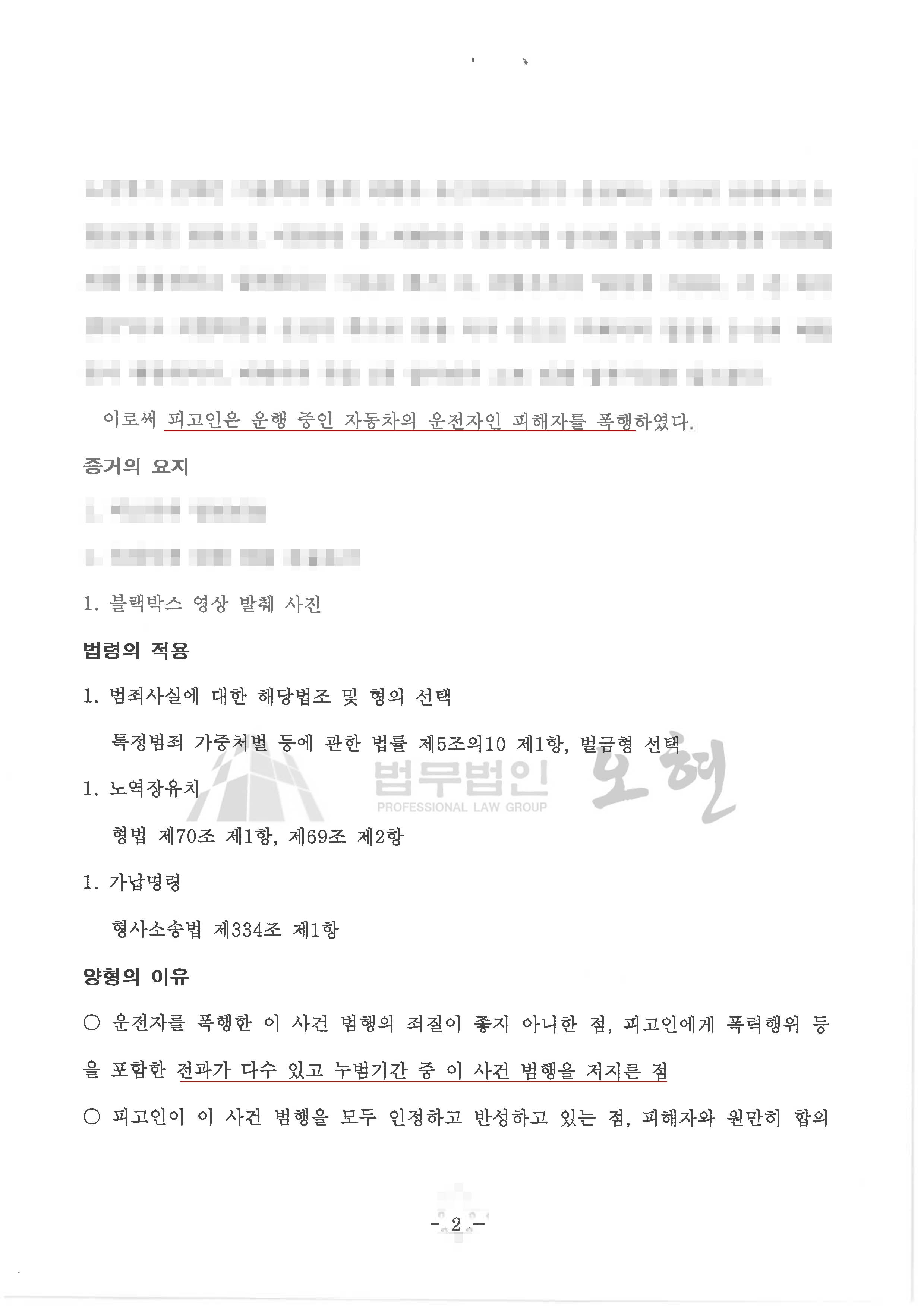 택시 내부를 촬영한 블랙박스(차량용 CCTV)가 존재하여 의뢰인이 택시를 운전하는 피해자를 폭행하였다는 사실이 명백하였는데, 의뢰인은 30여건의 범죄경력이 있을 뿐 아니라 사건 당시 교도소에서 출소한지 얼마 되지 않아 누범기간 중에 있었던 바, 집행유예를 기대할 수 없고 형이 가중될 수 있는 상황이었습니다.