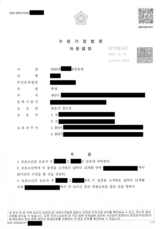 수원가정법원은 이러한 보조인의 변론을 적극 참작하여, 보호소년에게 제1호 처분(보호자 위탁) 및 성교육 수강명령 결정을 내렸습니다.