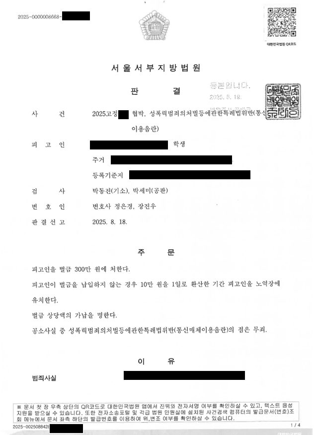서울서부지방법원은 변호인의 주장을 적극 수용하여, 공소사실 중 성폭력범죄의처벌등에관한특례법 위반(통신매체이용음란) 부분에 대해 '무죄'를 선고했습니다.