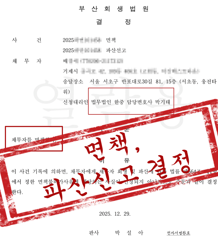 결과적으로 2025년 12월, 법원은 의뢰인에게 파산 선고와 함께 약 7000만 원이 넘는 채무 전액을 탕감하는 '면책 결정'을 내렸습니다.