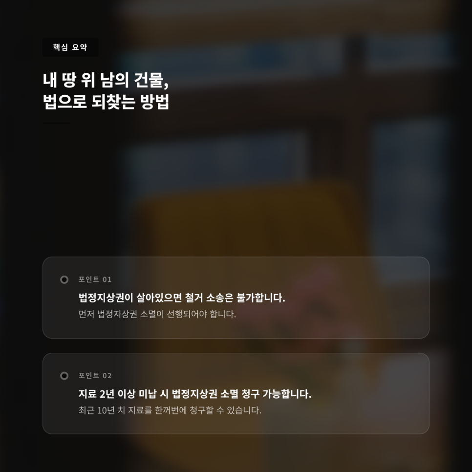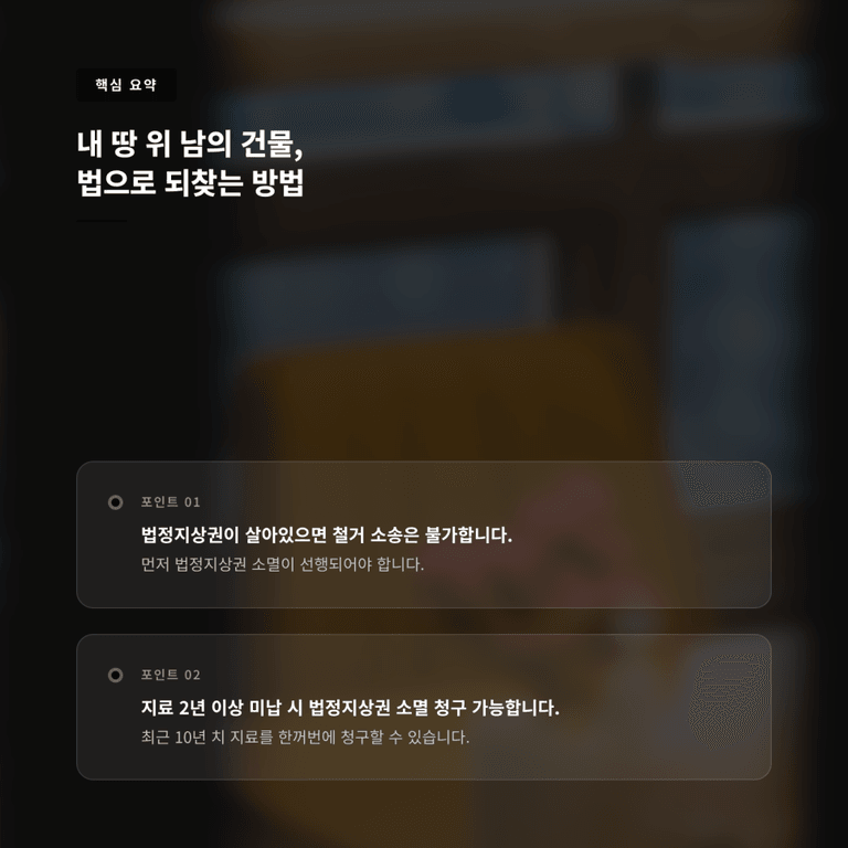 법정지상권은 영구적인 권리가 아닙니다. 가장 확실하게 법정지상권을 없애는 방법은 바로 '지료(땅 사용료)'를 청구하는 것입니다.