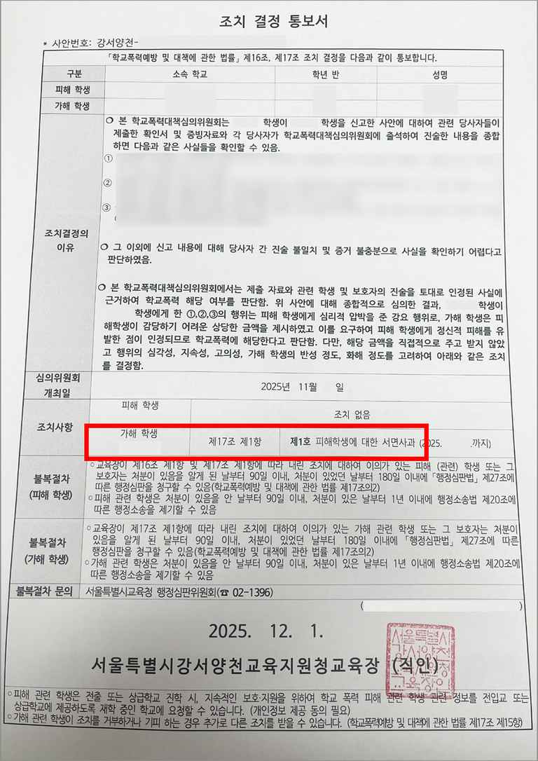 학교폭력대책심의위원회는 신고 내용 중 일부 행위에 대해 학교폭력에 해당한다고 의결하였으나, 실제로 금전을 주고받은 사실이 없었던 점, 행위의 심각성·지속성·고의성, 의뢰인의 반성 정도 등을 종합적으로 고려하여 학교폭력예방법상 가장 경한 조치인 제1호 피해학생에 대한 서면사과 조치를 결정하였습니다. 학교폭력 사건에서 받을 수 있는 조치 중 가장 낮은 수준의 결과였습니다.