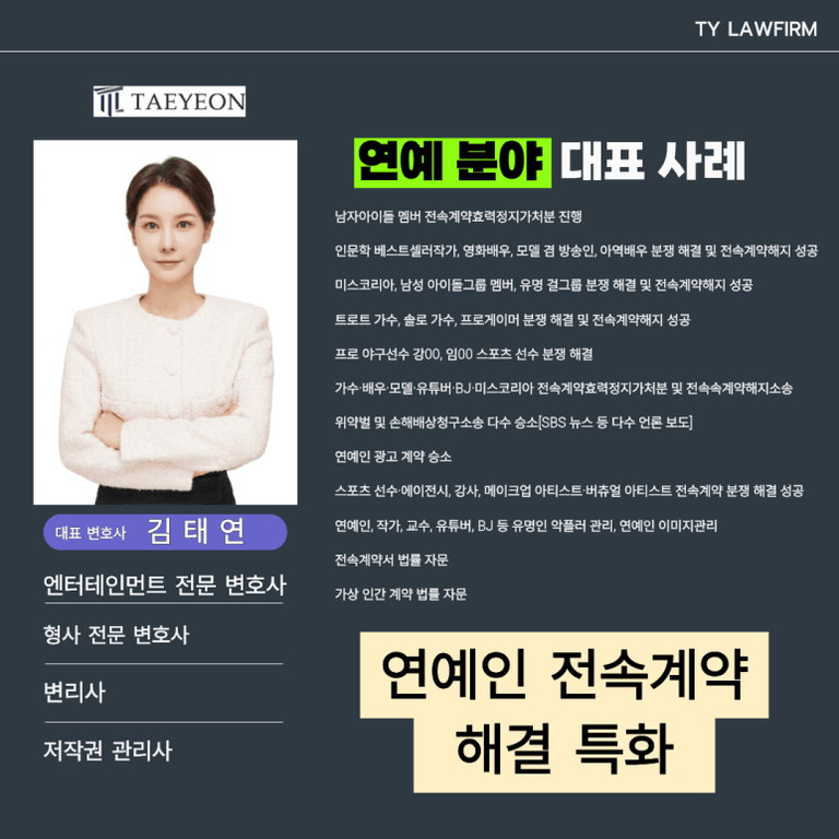 전속계약 문제로 고민이시라면 태연법률사무소와 함께 해결하시기 바랍니다.