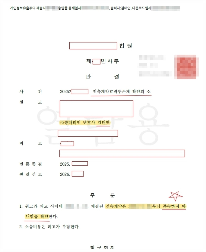 그렇다고 가처분에서 만족하지 않습니다. 가처분은 말 그대로 '임시방편'일뿐, 결국 전속계약 해지는 핵심적인 전속계약 부존재 확인 판결을 필요로 합니다. 태연법률사무소는 아티스트의 활동 보장을 위해 가처분 신청 후, 지속적으로 소송을 주도하여 전속계약 해지까지 성공적으로 이끌어내고 있습니다.