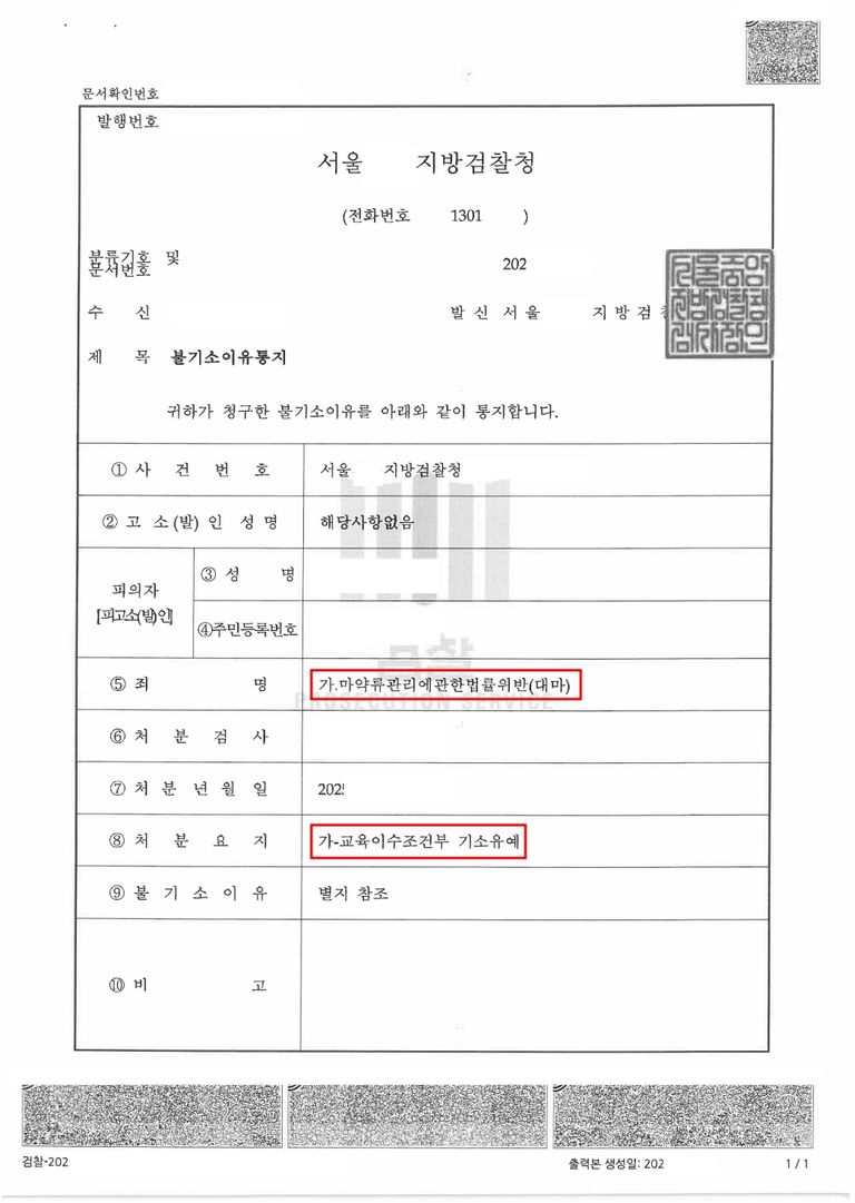 수사기관은 의뢰인의 유리한 사정을 참작하여, 대마 수입과 관련하여 무혐의, 대마 흡연과 관련하여 교육이수조건부 기소유예 처분을 내렸습니다.