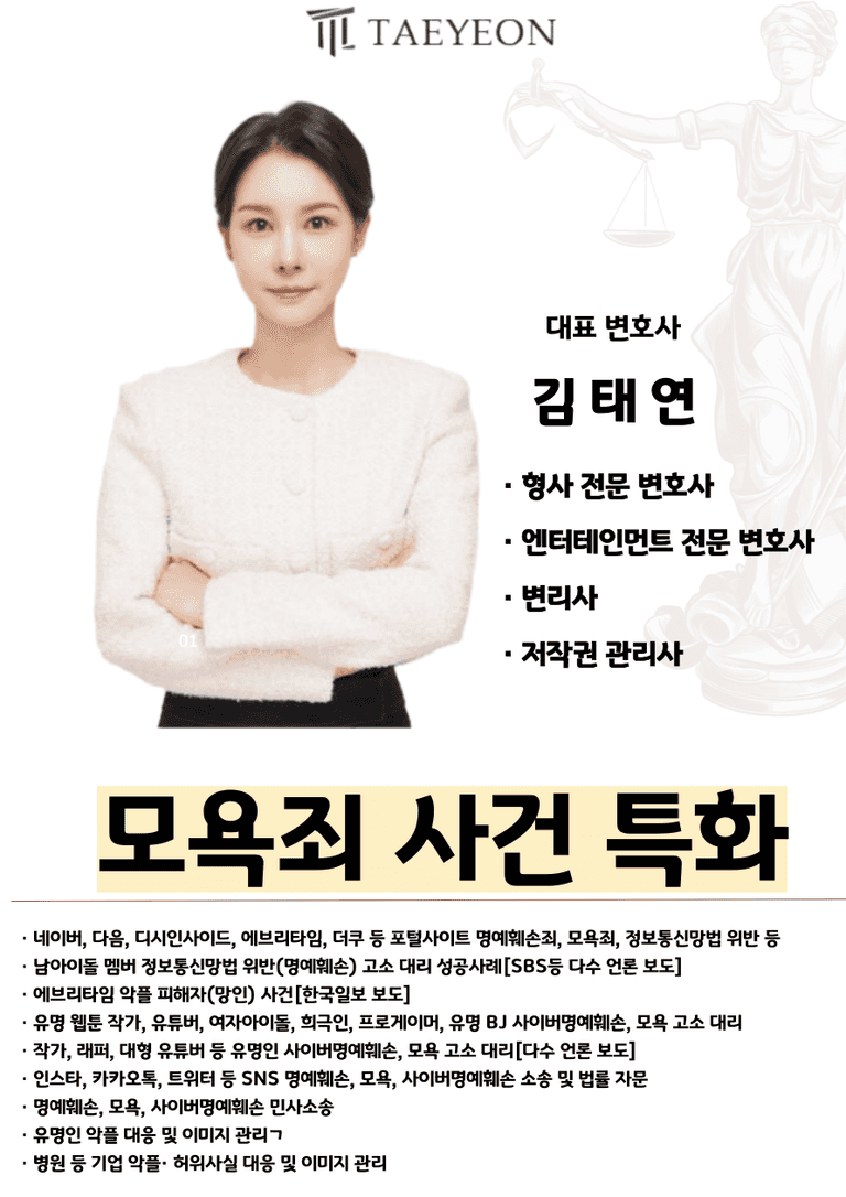 여기서 바로 모욕죄 사건 해결을 위해서는 왜 태연법률사무소를 찾아야 하는지 알 수 있습니다. 태연법률사무소의 김태연 대표 변호사 님께서는 '형사 전문 변호사'와 '엔터테인먼트 전문 변호사' 타이틀을 모두 보유하신 전문성을 토대로 아이돌, 가수, 작가, BJ, 유튜버 등 수많은 유명인 뿐만 아니라 일반인 분들의 모욕죄 사건도 전문적으로 해결해오고 있습니다.