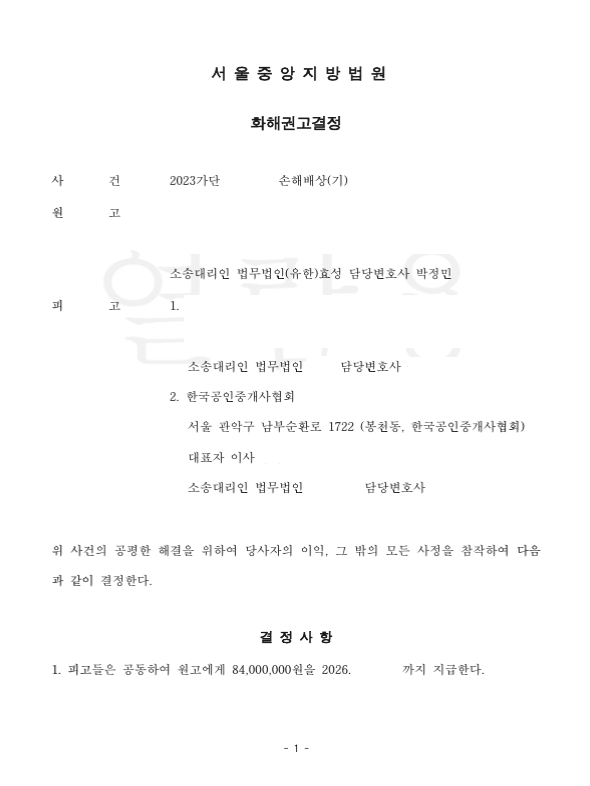 저는 즉각 피고 및 공인중개사협회를 상대로 손해배상청구소송을 제기하였고 법원은 청구액의 70%에 해당하는 금원을 지급하라는 화해권고결정을 내려 의뢰인은 이를 배상받았습니다.
