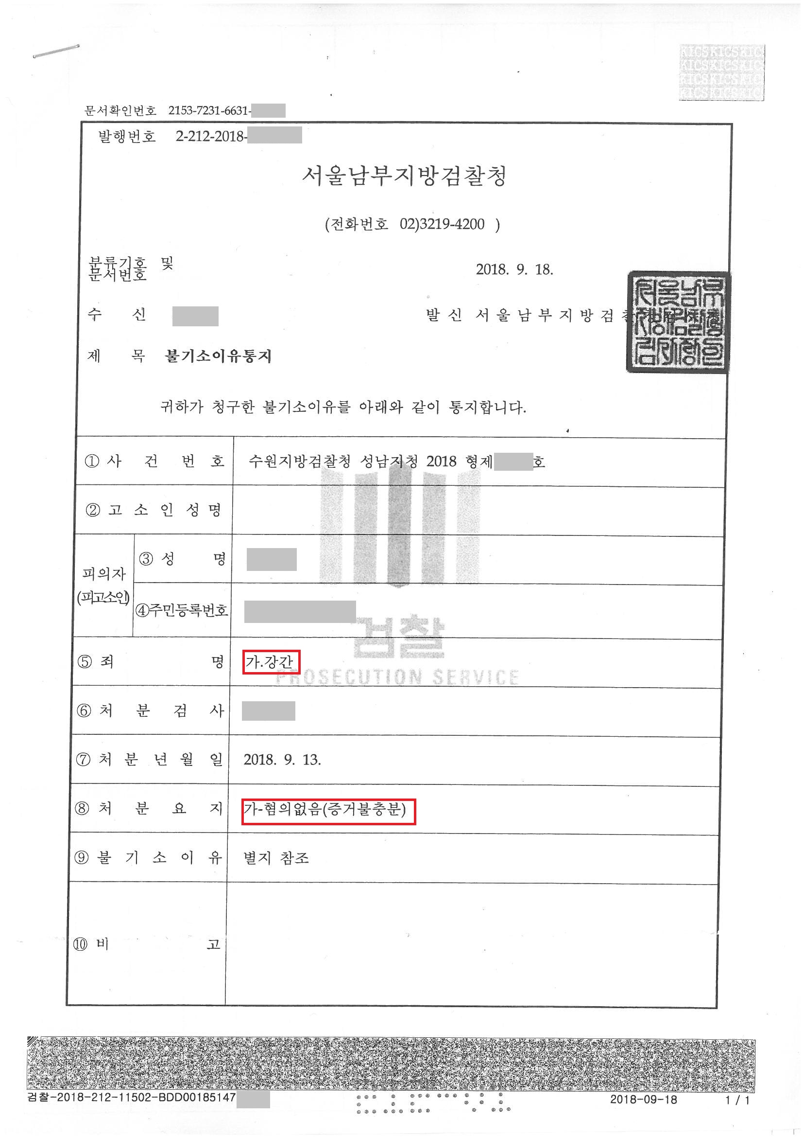 검찰은 성관계 전·후의 정황, 카카오톡 내용 등을 확인하여, 피해자 진술의 신빙성에 의심이 간다고 하여, 무혐의 처분을 하였습니다.