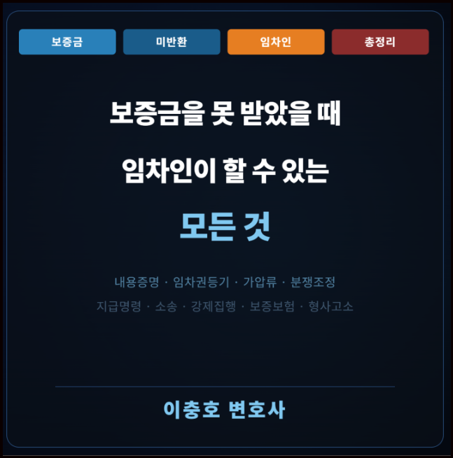 내용증명, 임차권등기명령, 가압류, 분쟁조정, 지급명령, 보증금반환소송, 강제집행, 보증보험 이행청구, 형사고소. 상황에 따라 어떤 카드를 어떤 순서로 쓰느냐가 회수 가능성을 결정합니다. 오늘은 임차인이 활용할 수 있는 모든 법적 수단을 순서대로, 상황별로 총정리합니다.