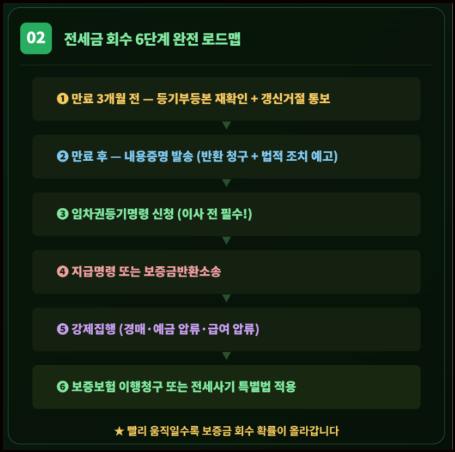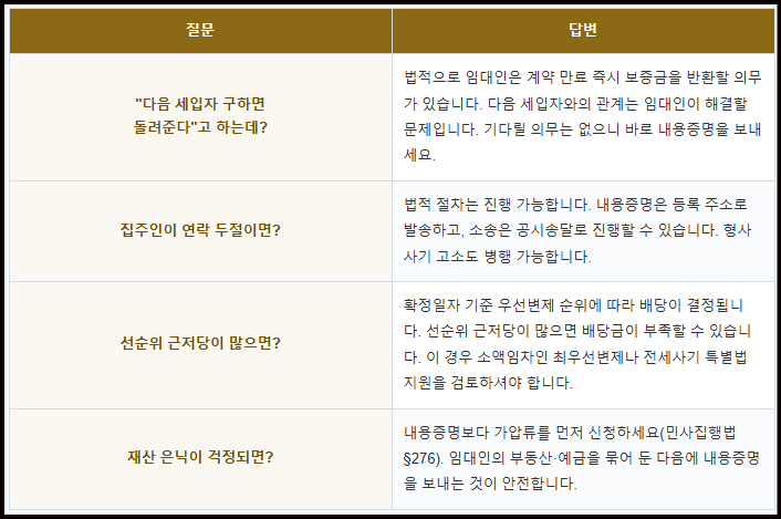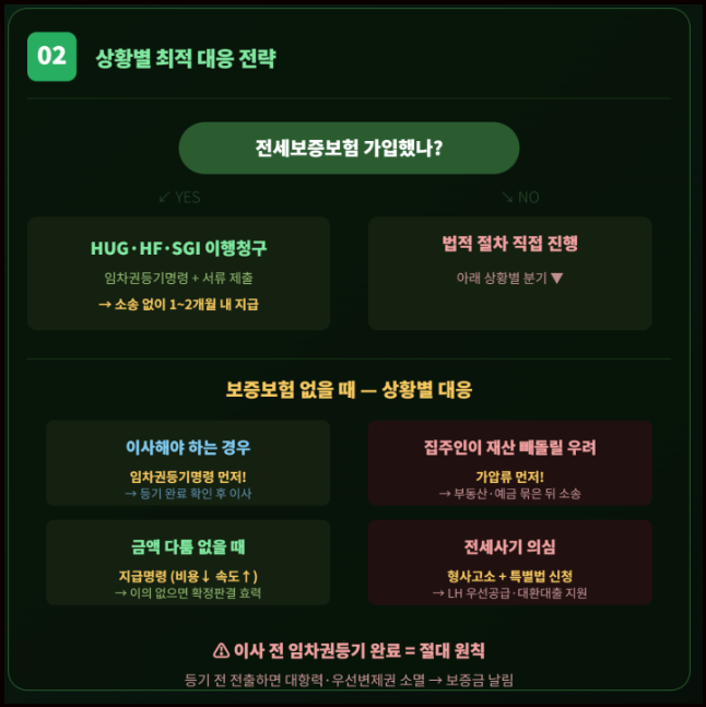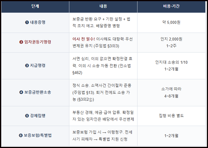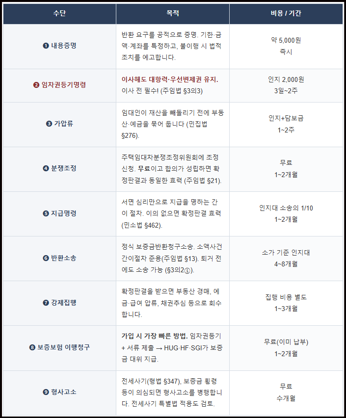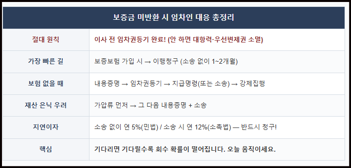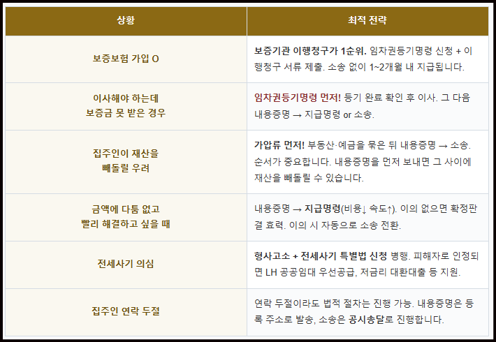 보증보험이 있으면 이행청구부터, 없으면 내용증명부터. 이사해야 하면 임차권등기부터. 재산 은닉이 걱정되면 가압류부터. 상황에 맞는 카드를 빠르게 꺼내는 것이 보증금을 되찾는 핵심입니다.