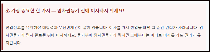 실무에서 가장 흔한 실수가 전입신고를 늦게 하는 것입니다. 대항력은 전입신고한 다음 날 0시에 발생합니다. 이사 당일에 전입신고를 했는데 그날 집주인이 대출을 받아 근저당을 설정하면, 근저당이 내 대항력보다 선순위가 됩니다. 계약서를 쓴 날 확정일자를 바로 받고, 이사 당일 전입신고를 마치는 게 기본 중의 기본입니다.