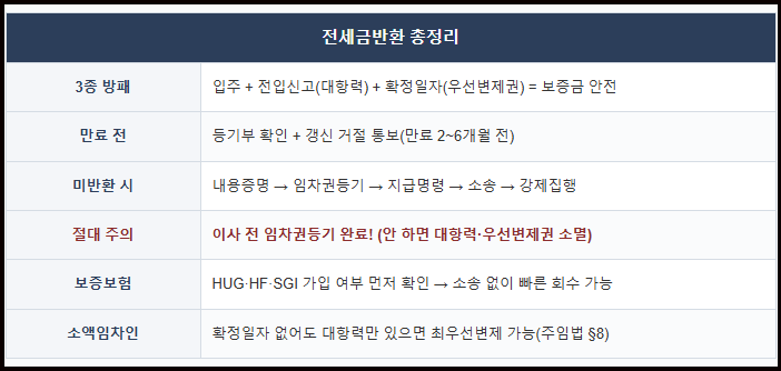 전세금 보호의 기초인 대항력·우선변제권·확정일자부터, 만료 후 미반환 시 대응 절차(내용증명→임차권등기→소송→강제집행), 보증보험 활용, 소액임차인 최우선변제, 전세사기 특별법까지 한 글에 총정리합니다.